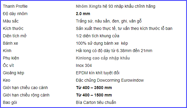 CỬA ĐI TRƯỢT NHÔM XINGFA Cửa đi mở trượt nhôm Xingfa được lắp ghép bởi thanh nhôm Xingfa nhập khẩu hệ 55, được mở tối đa bằng ½ diện tích khung cửa, phù hợp với tập quán sử dụng của người Việt Nam. Là loại cửa được mở bằng cánh trượt trên ray cửa. Cửa đi mở trượt nhôm Xingfa thường có từ 2 đến 6 cánh, có từ 2 đến 3 ray. Ưu điểm của cửa trượt là có thể mở được diện tích ô cửa lớn. ![]() ![]() THÔNG SỐ KỸ THUẬT CỬA MỞ TRƯỢT NHÔM XINGFA NHẬP KHẨUBẢNG MỘT SỐ KÍCH THƯỚC CỬA MỞ TRƯỢT THÔNG DỤNG